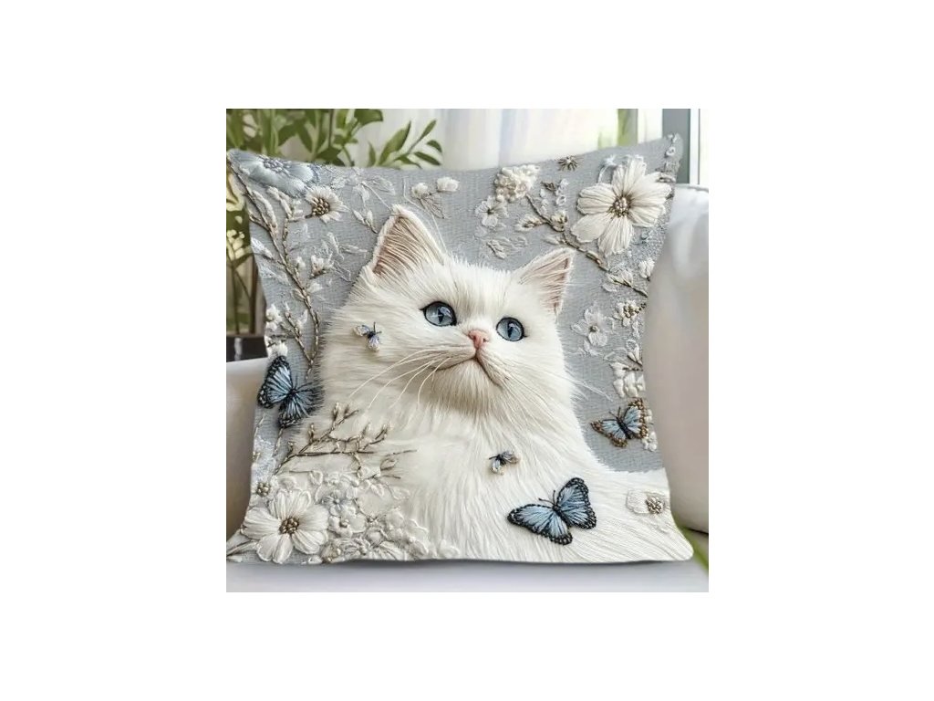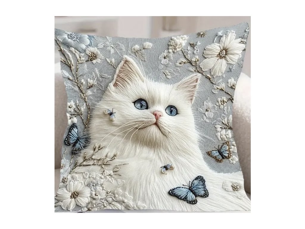 Polštář s bílou kočičkou a motýlem, s náplní, na zip, možno sundat a vyprat