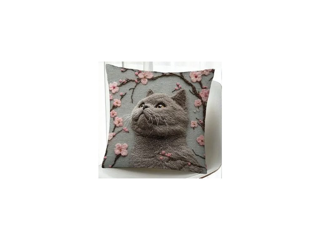 Polštář s hnědou britskou kočičkou a růžovými květy, s náplní, na zip, možno sundat a vyprat