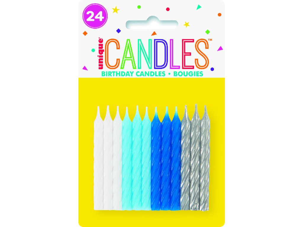 Barevné svíčky v bílé, světle modré, tmavě modré a stříbrné barvě - spirály, 7cm velké.
