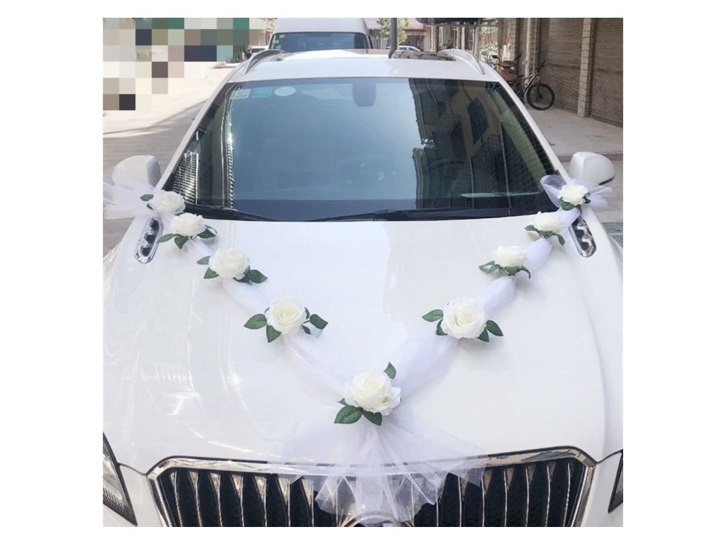 - obsahuje 11 růží připevněných na organze, stačí pouze uchycení na zrcátka a vepředu pod kapotu, další připevnění pomocí 4 ks přísavek, již upevněné na girlandě
