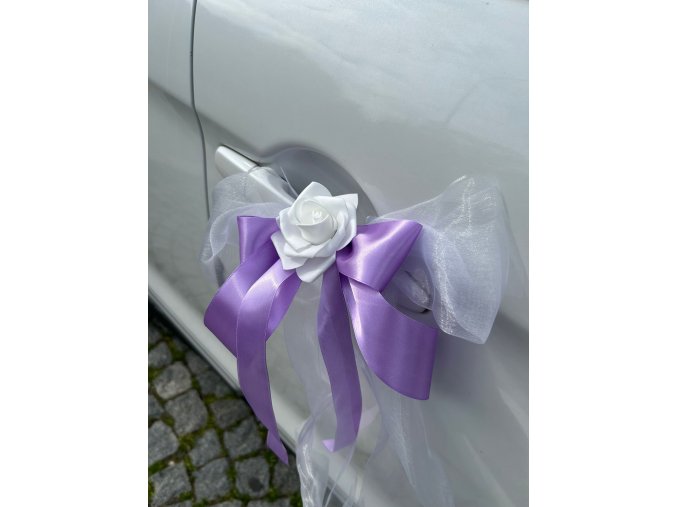Elegantní bílé mašle s lila na ozdobení auta, ideálně dveří či zrcátek