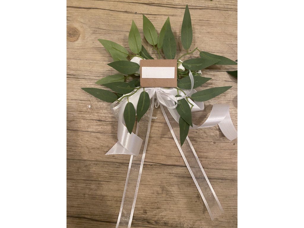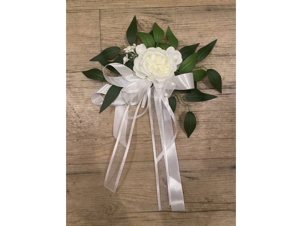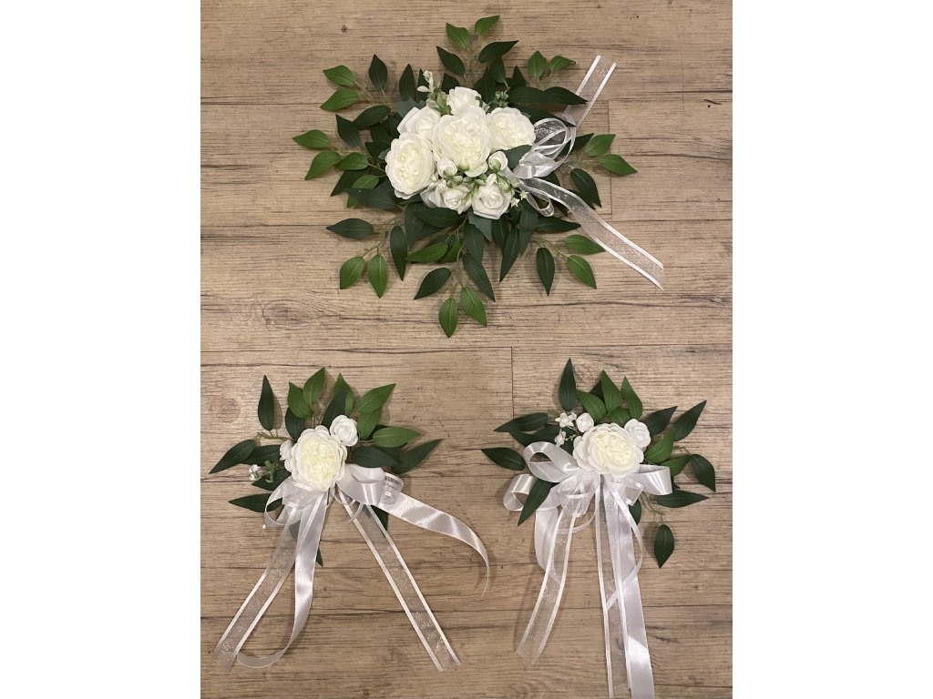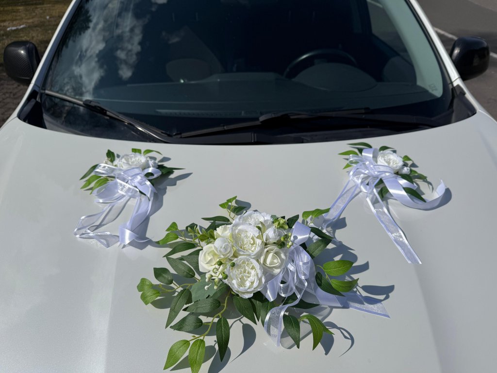 Sada na auto bílá s růžemi - větší aranž do středu kapoty nevěsty s 3 přísavkami a 2 aranže na zrcátka s oboustrannou lepící páskou na uchycení